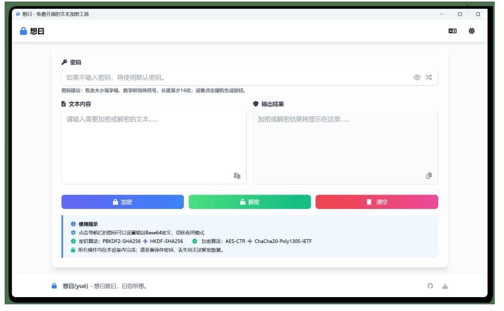 想曰(yuē) 是基于现代加密技术的文本加密工具,使用多算法级联加密方案,确保数据在本地完成加密/解密,保护隐私安全。