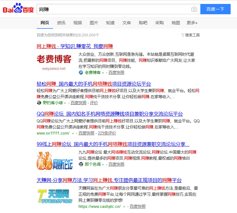 自从今年年初百度屏蔽“网赚”关键词之后,网赚圈一度认为网赚关键词以无价值,从我的友情链接来看,很多曾经大部分站长在优化的网赚一词都已经更换成了网赚系其他关键词了。可谁又想到,网赚一词如今又被百度放出来了。这两天无意中百度搜索,查到竟然有相关网站排名,连续3天都有,且基本无变化,可以肯定的是,网赚又回来了。