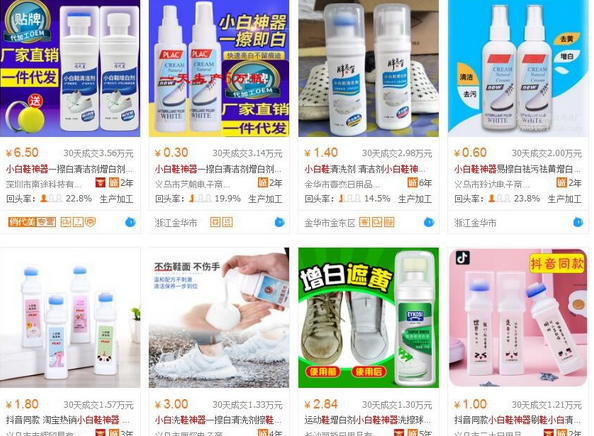 所以,我问了价格,不贵,9.9两瓶,然后,我买了两瓶,回家试了试,感觉效果还行,效果还行,然后我习惯性地去阿里巴巴批发网站看了看。这才知道原来这个项目是如此暴利,阿里巴巴网上批发这种小白鞋神器,价格便宜几毛钱一瓶,昂贵两三美元。可以想象,我花了9.9元买了两瓶。他们赚了多少利润?甚至不到90美分。
