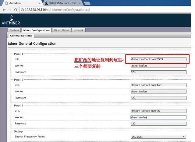 此时,我们将进入管理矿机的背景。在miner配置中,复制矿池的采矿服务地址,仅复制//以下内容。总共有三个地址,所有这些地址都必须复制到采矿机器背景中。