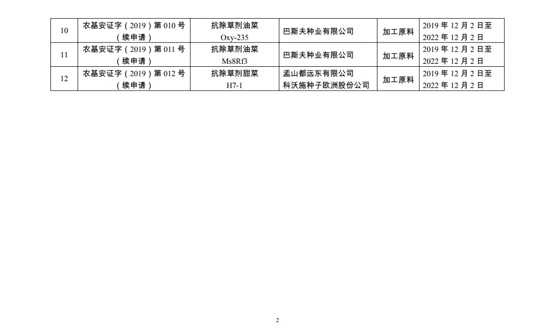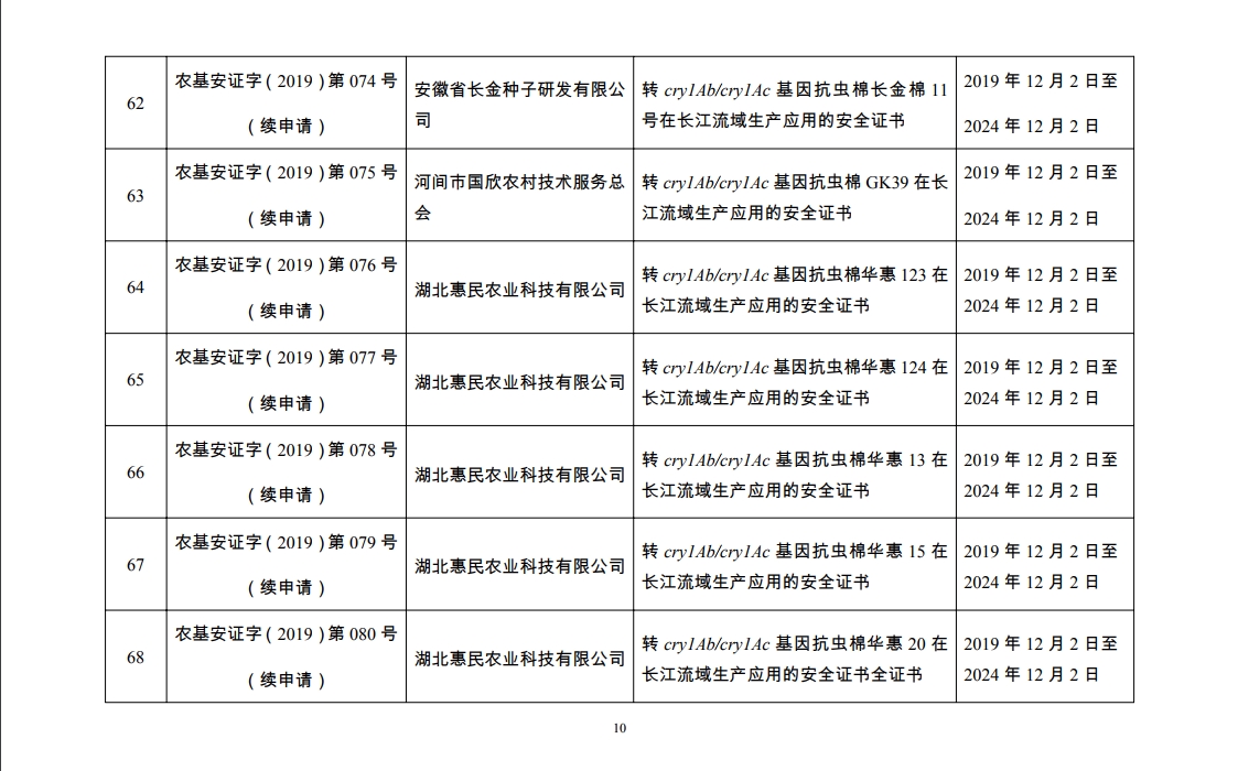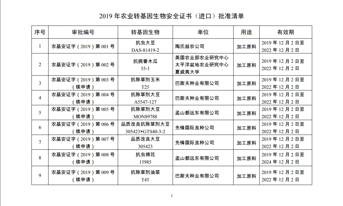 农业农村部公布2019年农业转基因生物安全证书批准清单