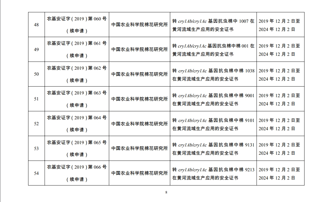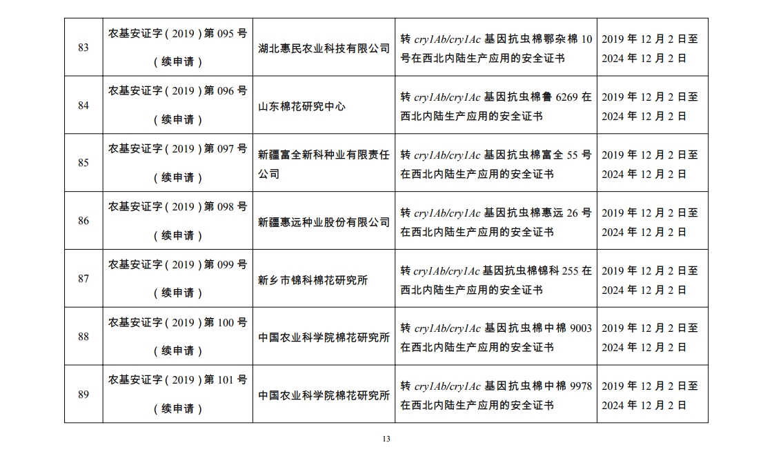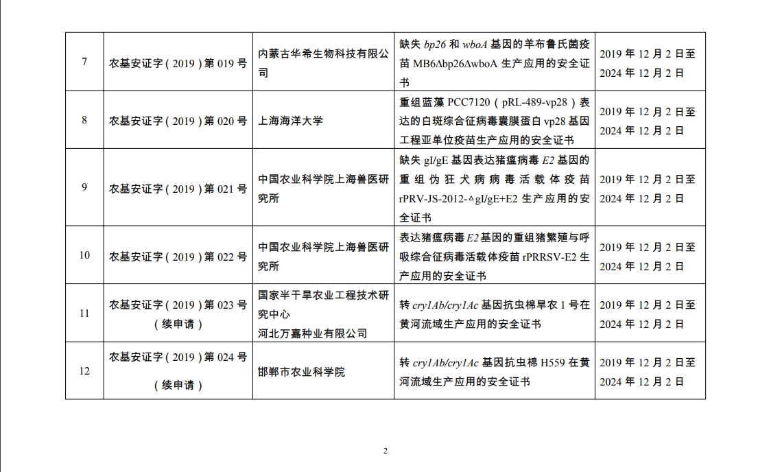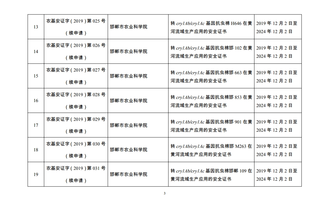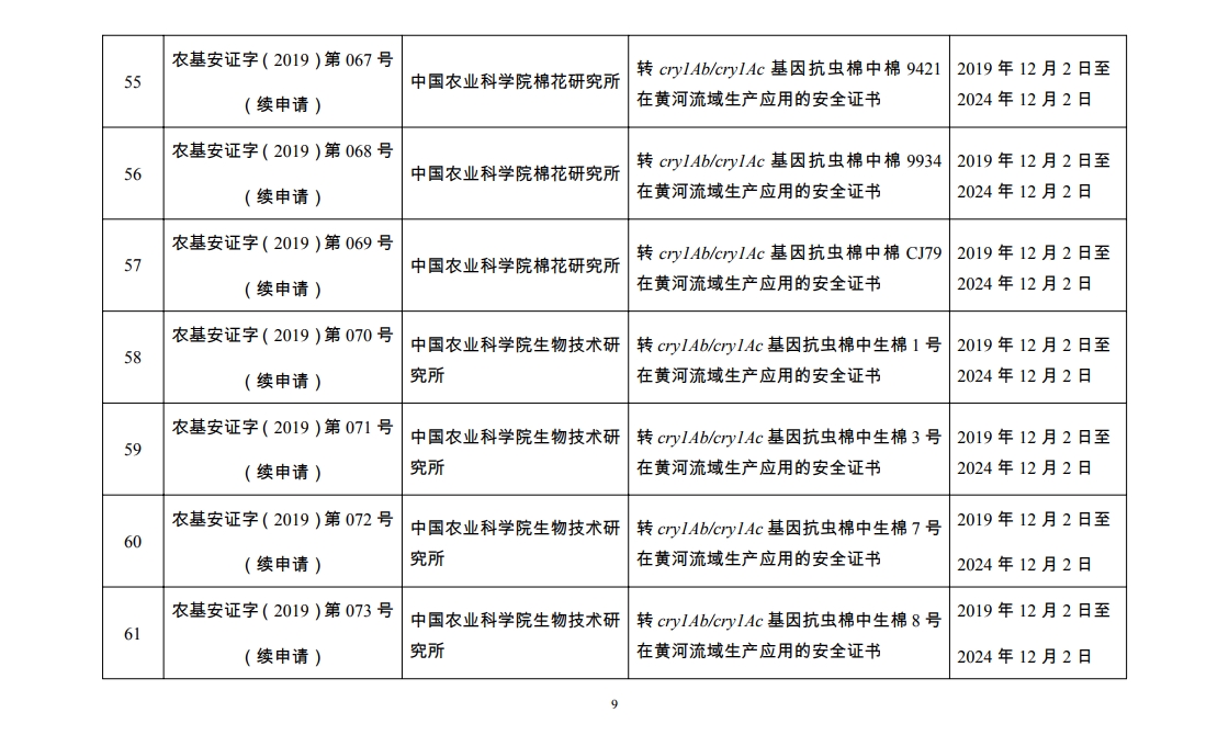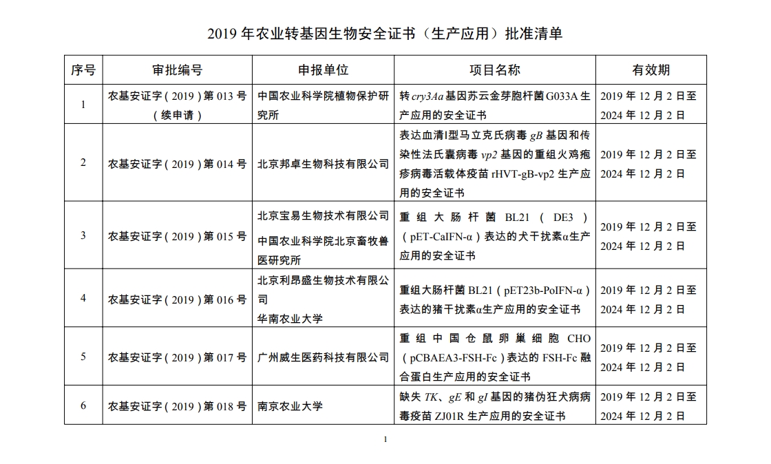 原标题:2019年农业转基因生物安全证书批准清单