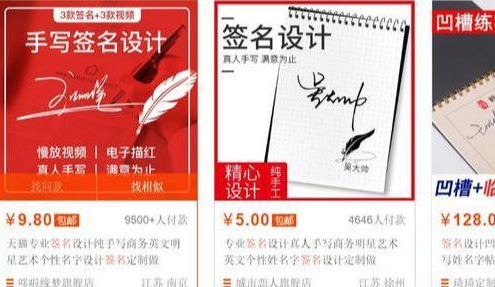 既然是零成本,自然也是不需要我们交学费去学书法之类的,我们要做的首先就是在某宝上找到几家优质的签名设计店家,这个是很关键的一部分,因为我们需要通过筛选来选择一家口碑好的店铺,这样帮别人设计出来的签名肯定是最高的。