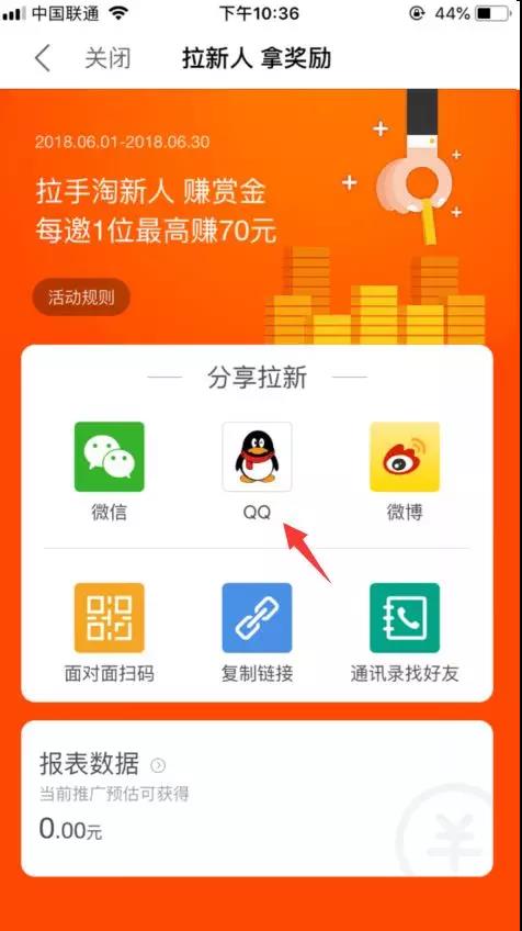 (1)某宝联盟提取拉新口令。你要生产一个某宝口令,让别人用这个口令注册新某宝。登陆手机某宝联盟,点击“拉手淘新人,赚赏金”,如图: