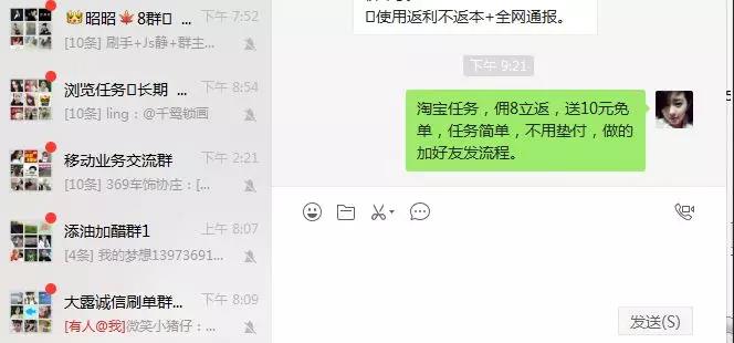 那么,资源毕竟有限,怎么才能加入更多群呢?整理一个话术文本,做单的时候直接复制给做任务的人,利用小hong包0.66-2元就可以裂变进入无数个任务群的,屡试不爽!