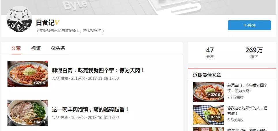 举个例子,比如日食记,节目绝对是电影级的,拥有269万粉丝,视频播放量才几万(当然,他的主战场在微博上面,头条却不太适合)