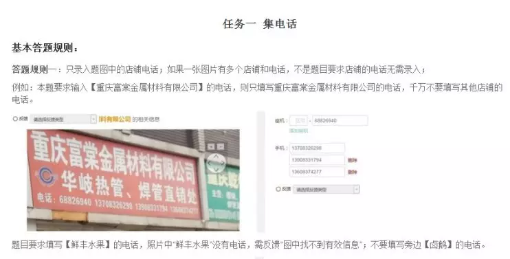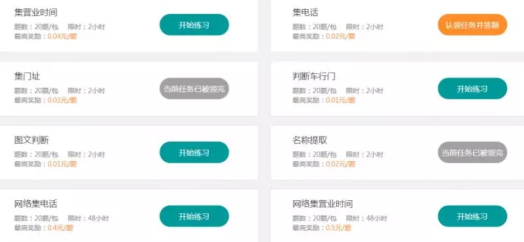 百度掘金的任务主要有集营业时间、集电话、集门址、图文判断这些,有各种题目包和对应价码,每种题目都必须先练习合格才能正式做题赚钱。