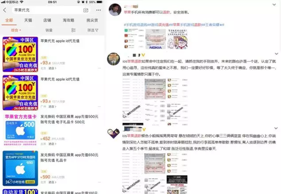 在淘宝、微博输入“苹果代充”、“苹果退费”等关键词,会弹出许多提供代充、代退服务的广告。