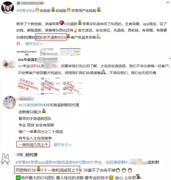 在用户与代退人员申请退费的成功率对比之下,苹果退费似乎成为了一项技术活,甚至有代退人员在网上公开招起了代理。