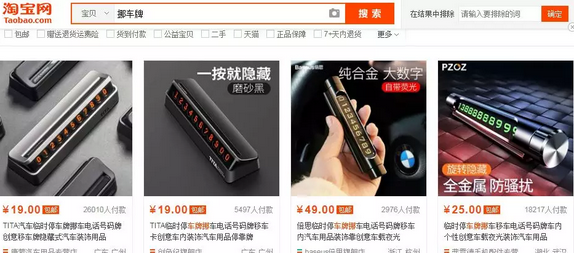 这里我们可以根据某宝的销量来做一个大致的估计,挪车牌这个关键词中的宝贝按照销量排行,只取销量前4名,那么存在个人电话号泄露风险的用户共有5万左右。