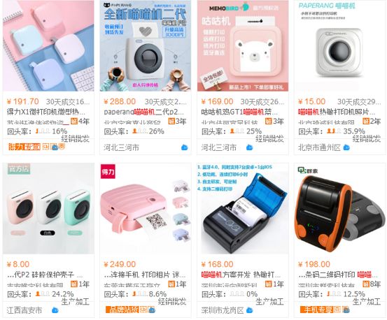 虽然品牌上“迷你打印机”市场占有率最高的是喵喵机和咕咕机(是两种“迷你打印机”品牌)。但由于迷你打印机制作工艺并不复杂,就出现了很多OEM的贴牌“迷你打印机”厂商,进货价比喵喵机和咕咕机更便宜,这使得贴牌倒手更赚钱。