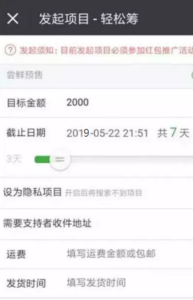 2.时间设定。众包时间从货架开始最短3天,最长30天。时间可以根据众筹设定的金额进行调整。