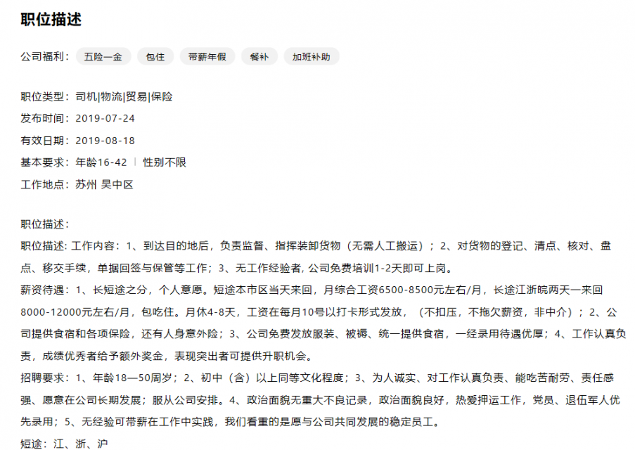 今天和一个朋友吃饭,说他表弟找工作被骗了,大概情况就是在百姓网上看到的一个招聘信息,里面说是要招聘一批跟车员,主要押运公司的货物,其实这种招聘广告有很多,老丁随便一搜就能搜到很多,诸如下面这样的: