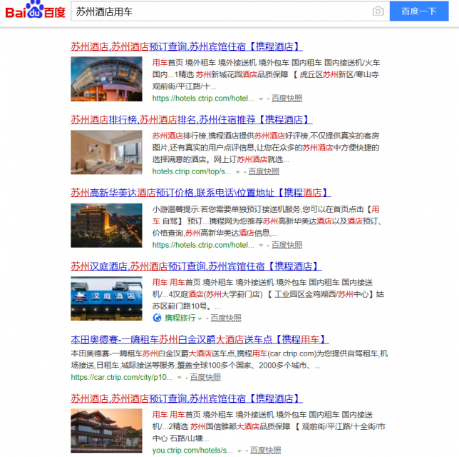 比如说你要搜苏州酒店用车,百度首页全部都是携程的网页,你是不是不选携程也得选携程了。
