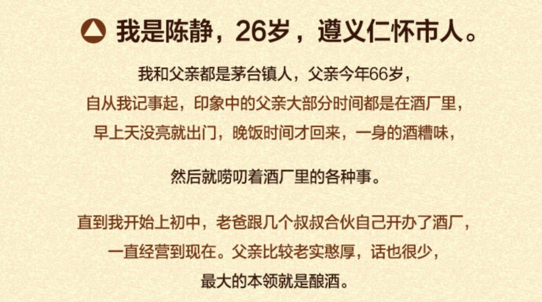我是陈静,26岁,遵义市人,我和父亲都是茅台镇人,父亲今年66岁,直到我上初中开始,老爸和几个叔叔合伙开办了酒厂。。