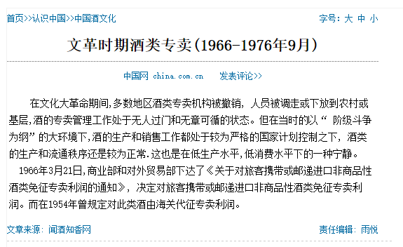 下面放一张china中国网发表的有关《文革时期酒类专卖》文章截图。