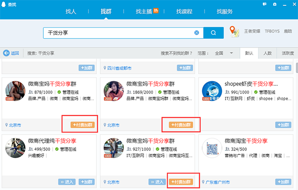 之前也有一些人借热点来做付费群的,收费也不贵。每个人10快,但是这种操作模式我不太建议操作,虽然说来钱快,但是不符合QQ群的运营策略,正是因为这种情况,目前QQ群暂时关闭了,可以通过条件搜索查找付费群的方式。