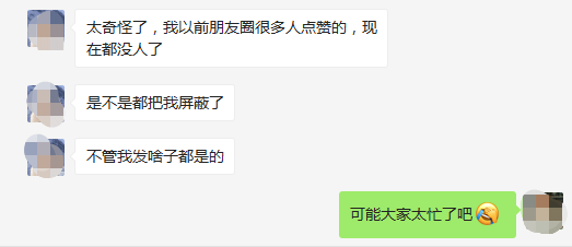 我一个做微商的朋友刚知道我是从事新媒体行业的,她这两天来跟我咨询了几个问题,其中有个就是她说每次发的朋友圈都没人点赞,是不是大家都把她屏蔽了。
