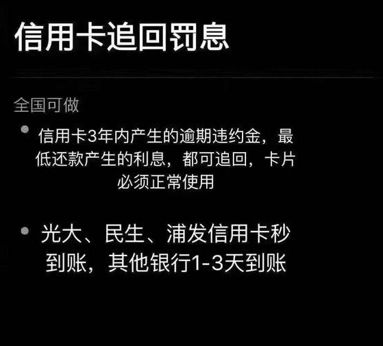 简单一点来说,就是现在有那么一批人,掌握了一定的方法技巧或是一定的资源,可以帮你操作,退回由信用卡逾期,信用卡最低还款额所造成的,额外罚息以及手续费。