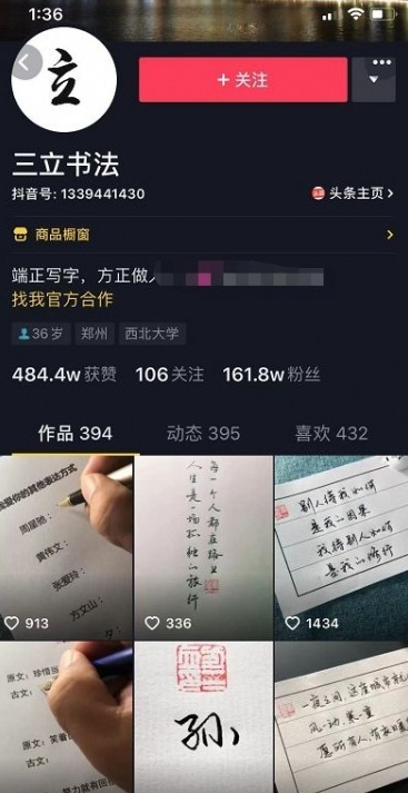 如下图,一个教硬笔的书法的抖音账号,如今有一百多万粉丝