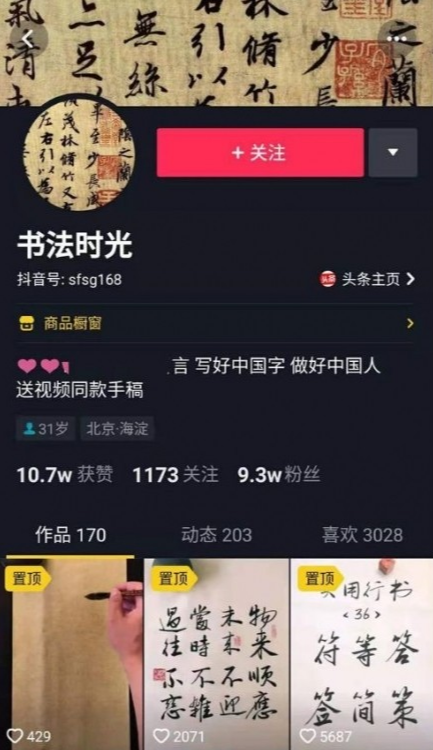 当然抖音上也有不少的书法案例号,都吸引了大批量的粉丝。