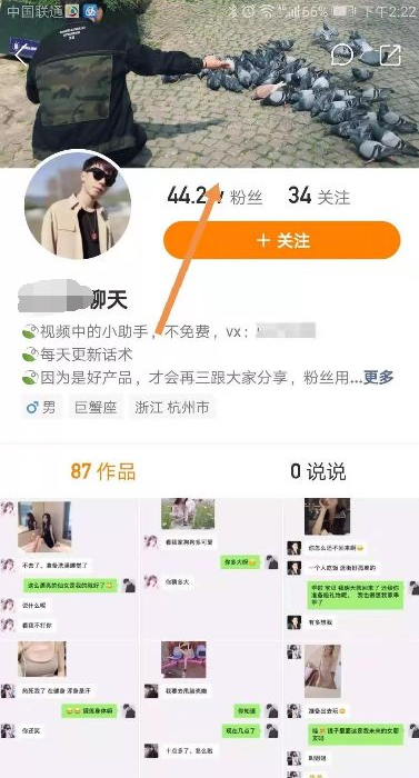 看这个家伙,仅仅发了87个作品,竟然吸来了40多万粉丝。他的作品是什么?其实就是一些男生女生之间的聊天记录截图,把这些截图一张一张的展示出来,再给配个好听的背景音乐就行。我顺藤摸瓜,最后找到这个人,才知道原来他就是卖尬聊神器的,会员版本299一个,也不便宜哦!