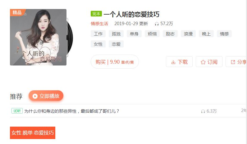 去买几本关于恋爱方式,聊天技巧,搭讪方式,等方面的书籍,每天在各大FM平台去照着读,分门别类的去输出这些内容,把自己打造成一个情感或者人际交流方面的专家,这也是我前面项目提到过的个人IP塑造。在音频的中间或者结尾处公布自己的微信公众号或者微信号,引导大家加你。比如你可以说:添加你的微信即可免费获取一份价值299的恋爱教程(当然这个教程是赠送品,可以买个稍微便宜点几块钱一份的那种去送)。也可以在课程介绍个人简介里面加自己的联系方式。