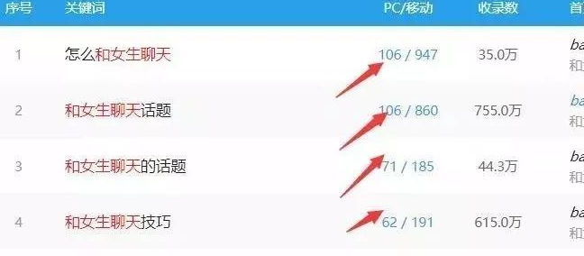 做单页站,或者博客类的网站,结合关键词工具查找到的相关关键词,发文章,文章内容仍然是关于恋爱方法技巧沟通技巧方面的,只是文章和标题中多出现几次类似于图片上这些关键词,比如“怎么和女士聊天”“和女生聊天话题大全”等等,融合到你的文章中去,多重复几次,当然还有很多其他相关领域的关键词你都可以去做,也可以多平台多账号操作,让自己的文章最大限度的去曝光。尽量去做竞争不是太激烈的关键词,走快排。很短的时间内就能做到首页。文章昵称或者签名,或者末尾留自己联系方式。引导到自己的公众号或者微信。