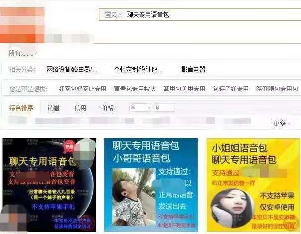 关于“语音包”目前在网上已经出现非常多相关的报道。在电商平台上被明码标价,带上了操作简单、2元可定制、20元即可购买上千条语音等标签。