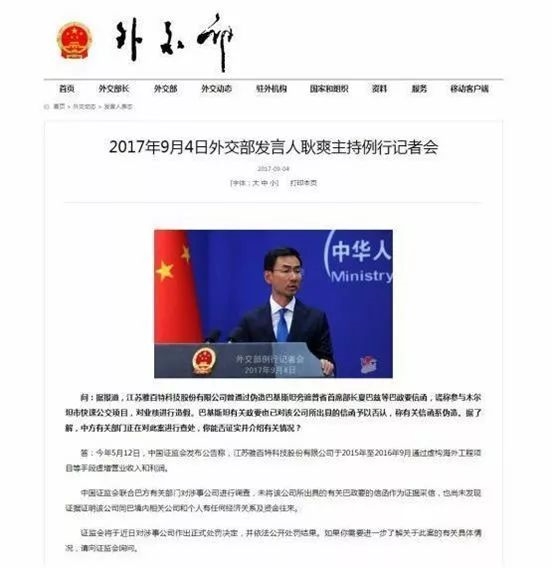 2017年9月4日,外交部发言人耿爽在例行记者会上证实,经证监会联合巴基斯坦有关部门调查,该公司所出具的有关巴政要的信函系伪造,也尚未发现证据证明,ST百特同巴境内任何公司和个人有经济关系及资金往来。