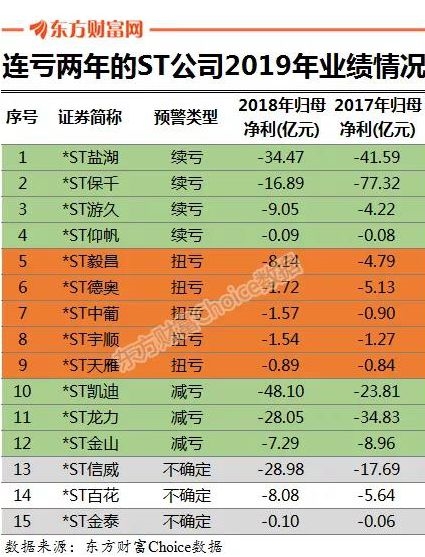 东方财富Choice数据显示,ST公司中已披露2019年业绩预告的公司有45家,其中2017、2018的归母净利润连续亏损的有15家,其中业绩扭亏的公司有5家(下图橙色区域),7家公司继续亏损(下图绿色区域),另外三家则是不确定。