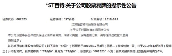 12月3日,ST百特发布公告称,因检察院未对公司提起公诉,公司将于12月4日开市起复牌,同时撤销退市风险警示并继续实行其他风险警示,公司股票简称由“*ST百特”变更为“ST百特”。