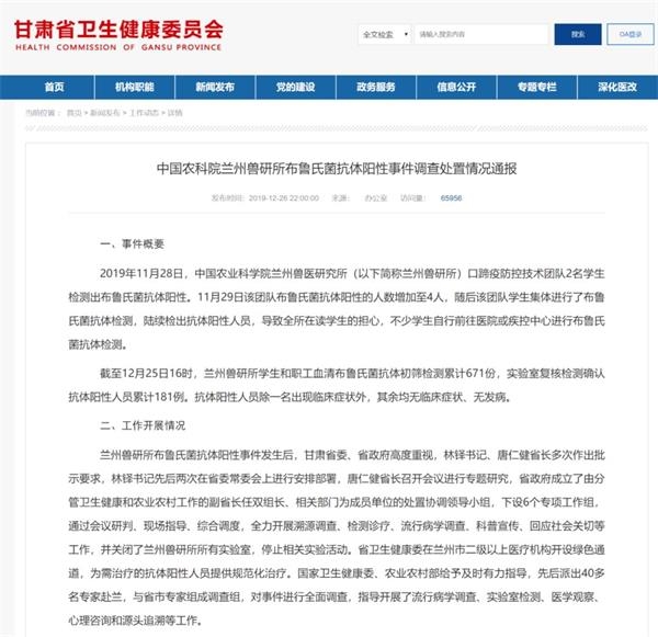 截至12月25日16时,兰州兽研所学生和职工血清布鲁氏菌抗体初筛检测累计671份,实验室复核检测确认抗体阳性人员累计181例。抗体阳性人员除一名出现临床症状外,其余均无临床症状、无发病。