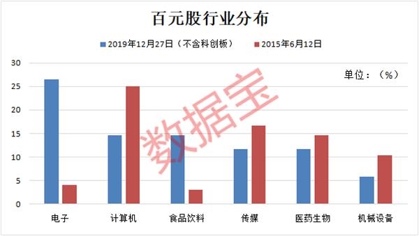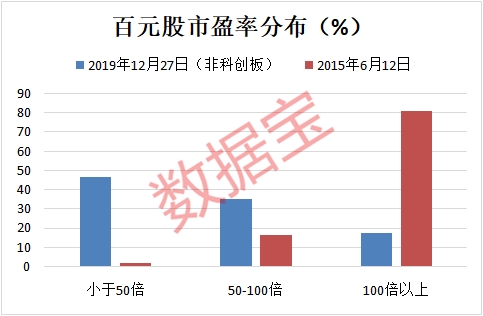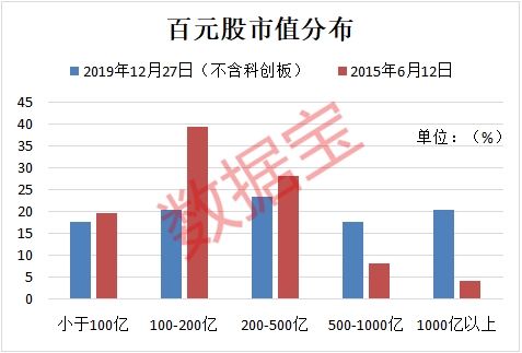 数据宝将当前两市百元股公司分布特征(不含科创板,下同)与2015年5178点时相比,可以更直观地看出市场的变化。