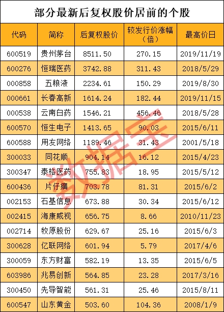 数据宝统计,在2000年后诞生的百元股中,最新后复权价超过500元的个股有18只,消费股占据主流。贵州茅台、恒瑞医药、五粮液、长春高新、云南白药、恒生电子和用友网络7股股价后复权后均超过1000元。