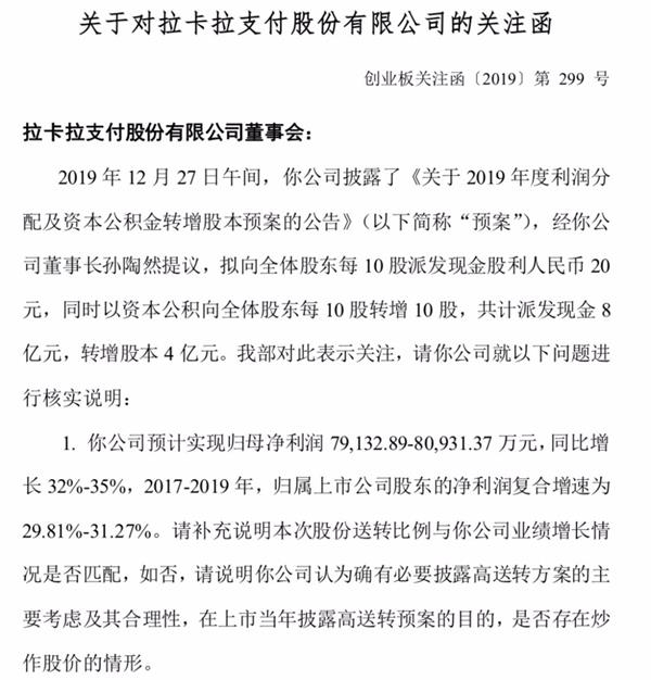 12月30日盘前,针对拉卡拉此前公告的拟10转10派20元,深交所向拉卡拉下发关注函,要求补充说明本次股份送转比例与公司业绩增长情况是否匹配,如否,请说明公司认为确有必要披露高送转方案的主要考虑及其合理性,在上市当年披露高送转预案的目的,是否存在炒作股价的情形。