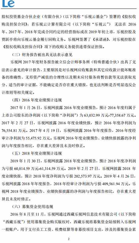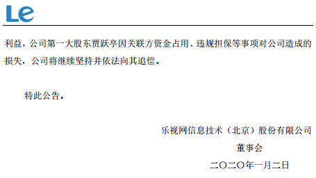 摘要 【乐视网:深交所对公司给予纪律处分】乐视网(300104)1月2日晚间公告,因公司存在控股股东关联方资金占用、违规担保、财务报告被出具无法表示意见、2016年度业绩预计违规、2018年度业绩预计违规、募集资金使用违规等行为,深交所对公司给予纪律处分。乐视网表示,公司第一大股东贾跃亭因关联方资金占用、违规担保等事项对公司造成的损失,公司将继续坚持并依法向其追偿。(证券时报网) 乐视网(300104)1月2日晚间公告,因公司存在控股股东关联方资金占用、违规担保、财务报告被出具无法表示意见、2016年度业绩预计违规、2018年度业绩预计违规、募集资金使用违规等行为,深交所对公司给予纪律处分。乐视网表示,公司第一大股东贾跃亭因关联方资金占用、违规担保等事项对公司造成的损失,公司将继续坚持并依法向其追偿。